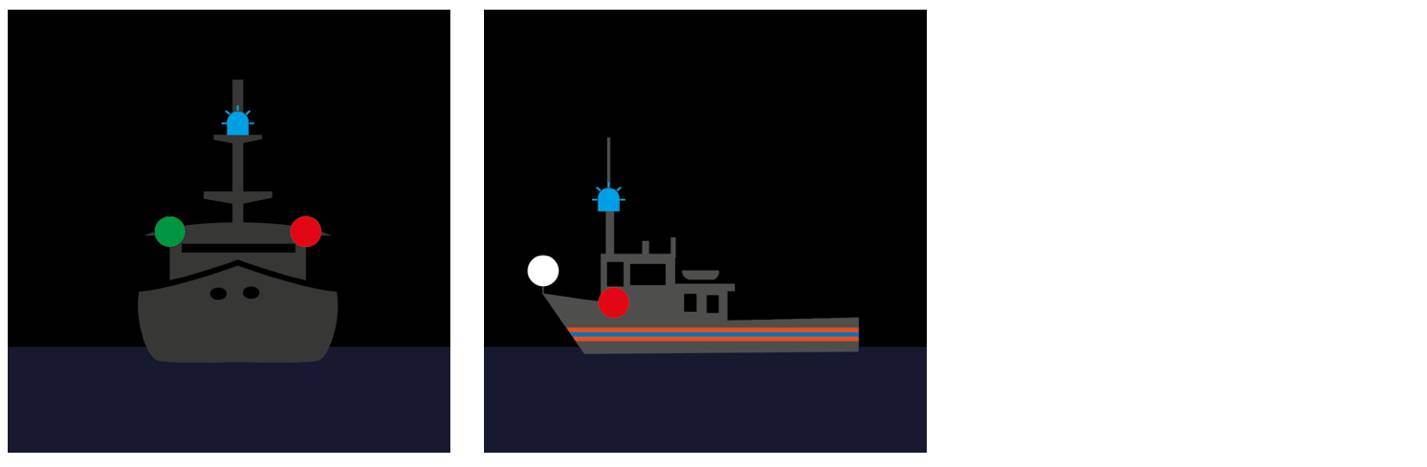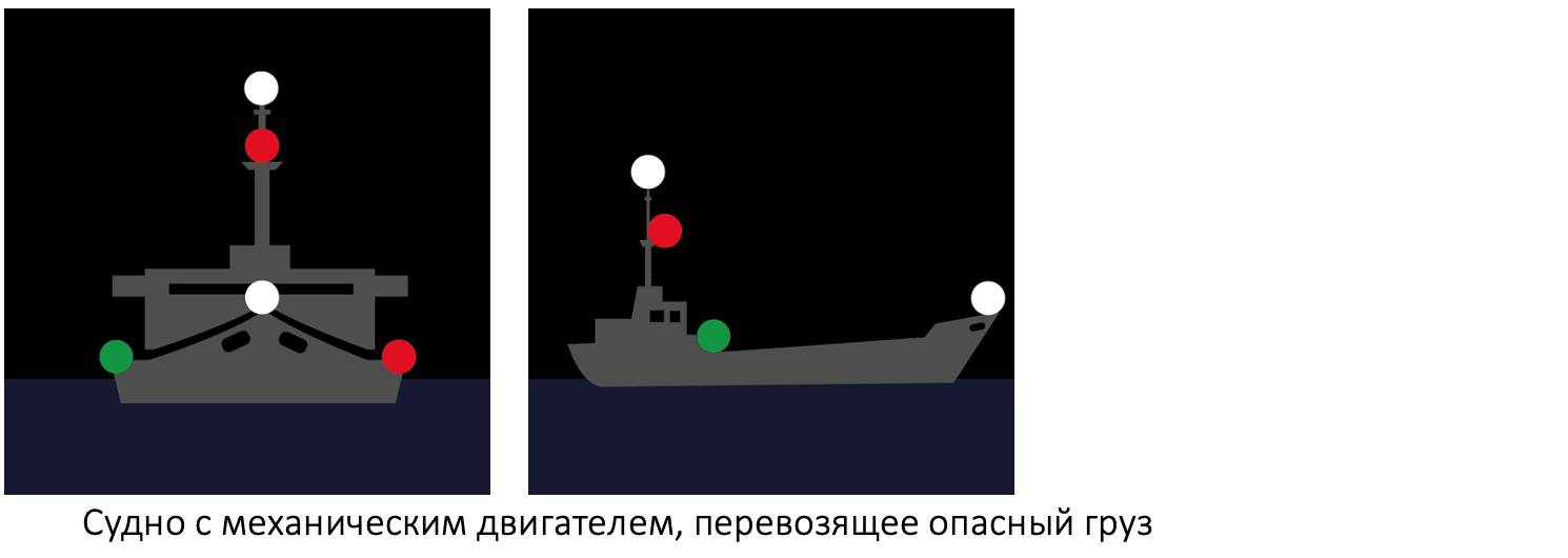в темное время суток – два круговых огня (верхний – зеленый, нижний – белый), расположенных по вертикальной линии на расстоянии не менее метра впереди и ниже топового огня, один топовый огонь (судно длиной менее 50 метров не обязано, но может нести такой топовый огонь), бортовые огни и один кормовой огонь при ширине судна пять метров и менее или три кормовых огня, расположенных в соответствии с пунктом 8 приложения № 1 к настоящим Правилам, при ширине судна более пяти метров;