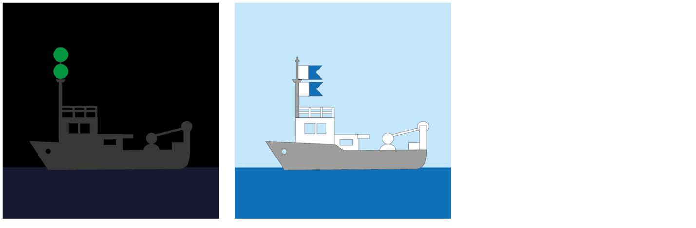 52. Дноочистительный снаряд и судно, занятое подводными работами (подъем судов, прокладка труб, кабелей без водолазных работ), должен выставлять в темное время суток один зеленый круговой огонь на мачте, а в светлое время суток – сигнальный флаг, представляющий собой двухцветное прямоугольное полотнище с косицами, разделенное по вертикали пополам на две части, при этом левая часть полотнища – белого цвета, а правая часть полотнища – синего цвета (далее – флаг "А").