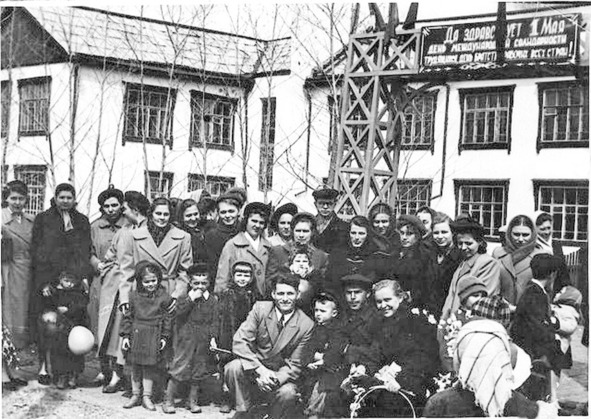 Если я захожу в здание с парадного входа, со стороны клуба и стадиона, то прохожу сначала под деревянной аркой, на которой всегда был плакат с каким-то лозунгом, которые в изобилии были развешаны в то время, где только можно, например: «Да здравствует 1 МАЯ!.. или МИР, ТРУД, МАЙ!», потом по деревянному тротуару, между невысокими заборчиками… По обеим сторонам растут деревья, тополя, что были посажены вначале 50-х и садили их вместе с учителями школьники, что оканчивали школу десять классов в 1955-ом, 1956-ом годах. Обычно здесь формировалась колонна от школы и отправлялась на демонстрацию. Отсюда радостными и стройными рядами, утопающими в цветах и плакатах, мы уходили приветствовать стоящих на трибунах, а они нас…