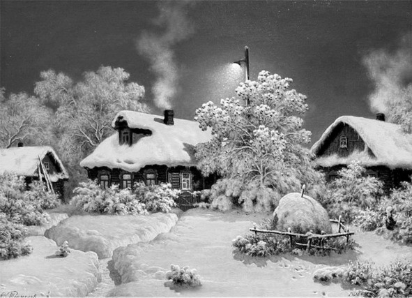Его совсем не видно только звук, только скрип снега под валенками спешащего домой человека.