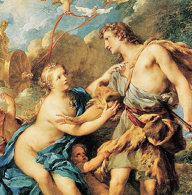 Однажды собаки Адониса во время охоты напали на след громадного кабана. Они подняли зверя и с яростным лаем погнали его. Адонис радовался такой богатой добыче; он не предчувствовал, что это его последняя охота. Все ближе лай собак, вот уже мелькнул громадный кабан среди кустов. Адонис уже готовится пронзить разъяренного зверя копьем, как вдруг кинулся на него кабан и своими громадными клыками смертельно ранил любимца Афродиты. Умер Адонис от страшной раны.