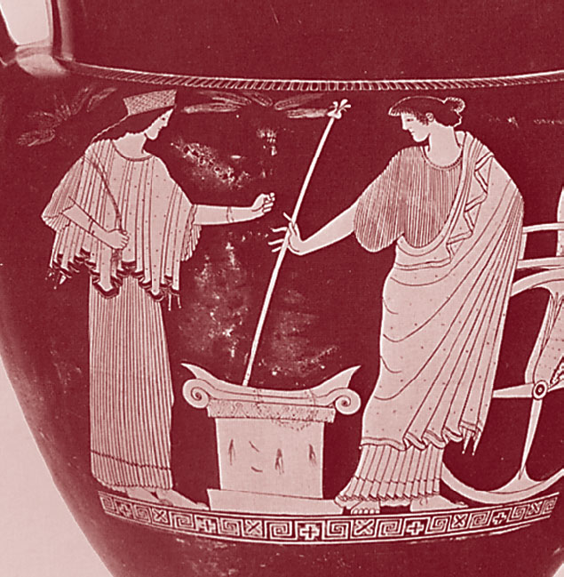 Увидали ее дочери царя Элевсина, Келея. Они удивились, заметив у источника плачущую женщину в темных одеждах, подошли к ней и с участием спросили, кто она. Но богиня Деметра не открылась им. Она сказала, что ее зовут Део, родом она с Крита, ее увезли разбойники, но она бежала от них и после долгих скитаний пришла к Элевсину. Деметра просила дочерей Келея отвести ее в дом их отца; она согласилась стать служанкой их матери, воспитывать детей и работать в доме Келея. Дочери Келея привели Деметру к матери своей Метанейре.