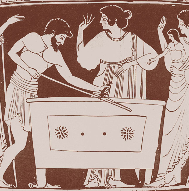 Данаиды вышли на берег. Никого не было видно вокруг. Наконец вдали показалось облако пыли. Быстро приближалось оно. Вот уже в облаке пыли видно сверкание щитов, шлемов и копий. Слышится шум колес боевых колесниц. Это приближается войско царя Арголиды, Пеласга, сына Палехтона. Извещенный о прибытии корабля, Пеласг явился к берегу моря со своим войском. Не врага встретил он там, а старца Даная и пятьдесят его прекрасных дочерей. С масличными ветвями в руках встретили они его, моля о защите. Простирая к нему руки, с глазами, полными слез, молят его прекрасные дочери Даная помочь им против гордых сыновей Египта. Именем Зевса, могучего защитника молящих, заклинают Данаиды Пеласга не выдавать их. Ведь не чужие они в Арголиде – это родина их прародительницы Ио.
