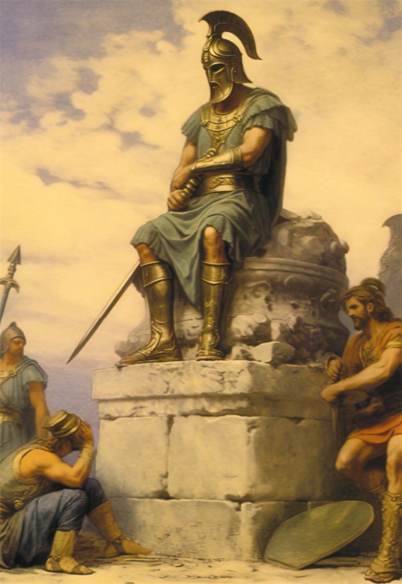 Прислонясь к колонне и прикрывшись блестящим щитом Афины, бьется с врагами Персей. А они со всех сторон окружили героя, бой вокруг него все неистовей. Видя, что ему грозит неминуемая гибель, воскликнул громко могучий сын Данаи: