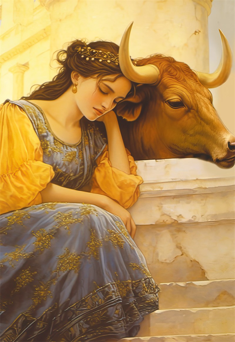 Чтобы не испугать своим появлением юной Европы, он принял вид чудесного быка. Вся шерсть Зевса-быка сверкала как золото, лишь на лбу у него горело, подобно сиянию луны, серебряное пятно; золотые же рога быка были изогнуты, подобно молодому месяцу, когда впервые виден он в лучах пурпурного заката. Чудесный бык появился на поляне и легкими шагами, едва касаясь травы, подошел к девам. Сидонские девы не испугались его, они окружили дивное животное и ласково гладили его. Бык подошел к Европе, он лизал ей руки и ласкался к ней. Дыхание быка благоухало амброзией, весь воздух был напоен этим благоуханием. Европа гладила быка своей нежной рукой по золотой шерсти, обнимала его голову и целовала. Бык лег у ног прекрасной девы, он как бы просил ее сесть на него.