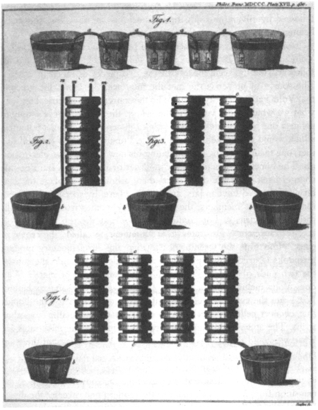 Теперь я сразу перейду ко второму примеру и обращусь к началу XIX столетия. 1800 год, помимо прочего, замечателен тем, что в этом году Вольта открыл электрическую батарею. Об этом открытии он сообщил в письме к сэру Джозефу Бэнксу, президенту Королевского общества[9]. Письмо предназначалось для публикации и было снабжено иллюстрацией, воспроизведенной на рис. 1.