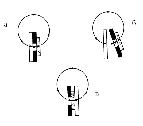 Как и в предшествующем примере, такой взгляд на электрическую батарею приводит к разнообразным следствиям. Как показано на рис. 2, например, переход от представлений Вольты к современным сохраняет направление потока. Современное изображение элемента (рис. 2, в) можно получить из диаграммы Вольты (рис. 2, а) посредством перемещения левой пластины по кругу (рис. 2, б). При этом то, что было внутренним потоком, становится внешним, и наоборот. В диаграмме Вольты внешний поток идет от черной пластины к белой, поэтому черная пластина является положительной. В современном изображении и направление потока, и полярность противоположны.