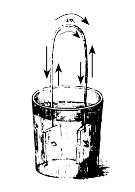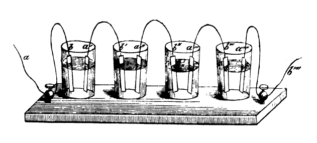 Это лишь наиболее очевидные следствия электростатического понимания электрической батареи, но имеются и другие. Например, концепция Вольты не замечает концептуальной роли внешней цепи. То, что представляется нам внешней цепью, для Вольты является путем разряда, подобного разряду, который разряжает лейденскую банку. Поэтому ранние рисунки батареи не показывают внешней цепи, если нет стороннего вмешательства, например, электролиза или нагревания проволоки. Не раньше 1840-х годов в книгах по электричеству начинают появляться современные изображения электрических ячеек. На них уже можно видеть либо внешнюю цепь, либо указания на ее присутствие[10] (см. рис. 3 и 4).