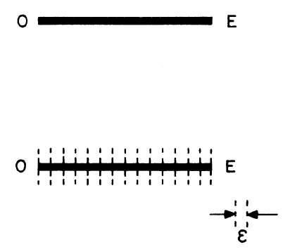 Для нас здесь важен лишь один аспект метода Больцмана. Он рассматривал общую кинетическую энергию молекул Е. Чтобы использовать теорию вероятностей, он мысленно разделял эту энергию на маленькие кусочки, или элементы, величины г, как показано на рис. 5. Затем воображал случайное распределение молекул среди этих кусочков, вытаскивая пронумерованные бумажки из урны, чтобы установить место каждой молекулы, а потом исключая все распределения с общей энергией, отличной от Е. Например, если первая молекула попадала в последний отрезок (энергия Е), то единственно приемлемым распределением оказывалось бы такое, при котором все другие молекулы попадали в первый отрезок (энергия о).