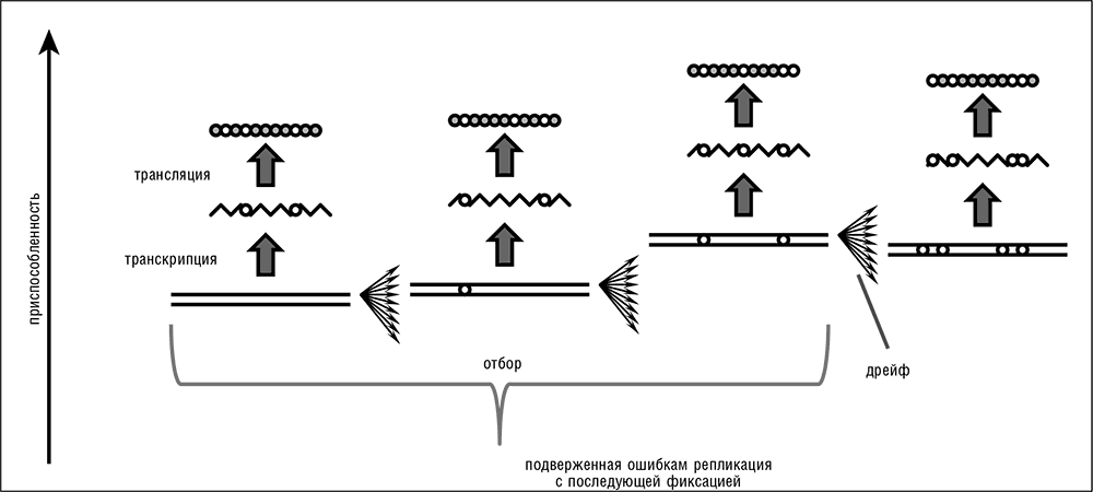 Рис. 2–1. Передача информации в биологических системах и превращение естественного отбора и генетического дрейфа в эпифеномены репликации. Белые круги на схеме обозначают изменения относительно оригинальной последовательности.