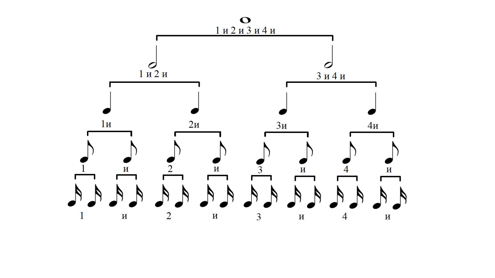 Теперь перенесем все это на время. Целая нота считается таким образом: 1 – и – 2 – и – 3 – и – 4 – и. Как на уроке физкультуры:
