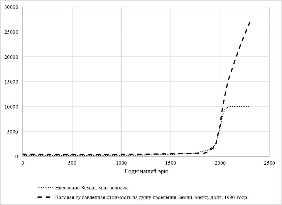 Хотя темпы прироста быстро сокращаются, мировое население пока что растет, так что поверхностному наблюдателю может показаться, будто рост населения будет продолжаться вечно. Самые оптимистичные предсказания звучат накануне самых трудных перемен. «Скоро память о мальтузианских силах исчезнет, и человечество как целое вступит в новую фазу своего пути» (Галор 2022, с. 274). На самом деле «мальтузианские силы», то есть природные и культурные ограничители численности людей, возвращаются вновь, теперь уже не применительно к отдельным общинам, а применительно к человечеству в целом. Человечество как целое вступает в новую фазу своего развития, в которой его численность не будет расти, рост душевого ВВП будет более медленным, чем это было в последние 200 лет – в фазу обычного самовоспроизводства. Принципиальное отличие обычного самовоспроизводства от простого или расширенного состоит в том, что здесь график душевого ВВП отделяется от графика численности населения, в этом наглядно выражается переход в царство искусственного, в котором масштабы культуры растут независимо от масштабов общества.