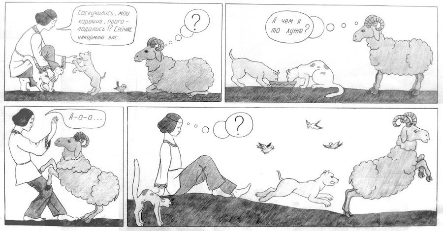 “Догадливый баран” по рассказу Л.Н.Толстого.Нарисовала студентка 2 курса А.Гирфанова. 1999 год