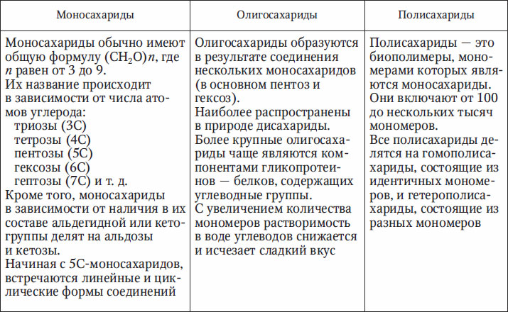 Углеводы – это наиболее распространенная в природе группа органических веществ. Основная их функция – энергетическая. Все углеводы содержат гидроксильные группы (—ОН) вместе с альдегидной или кетогруппой. Выделяют три группы углеводов (табл. 2.1).