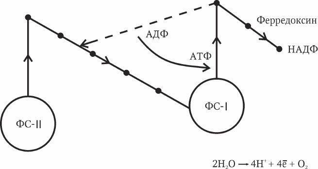 Под действием света электроны реакционного центра фотосистемы II возбуждаются, переходят на акцептор электронов и переносятся по электронно-транспортной цепи к фотосистеме I. Потерянные электроны хлорофилла Р-680 заменяются электронами молекул воды в результате одновременного процесса фотолиза – ферментативного расщепления воды. В фотосистеме I электроны под действием света возбуждаются, переносятся на свой акцептор и через белок ферредоксин – на никотинамидадениндинуклеотидфосфат (НАДФ), который восстанавливается (НАДФ-Н2). Электроны хлорофилла Р-700 заменяются электронами фотосистемы II. Таким способом осуществляется однонаправленный поток электронов от реакционного центра фотосистемы II к НАДФ (рис. 2.7).