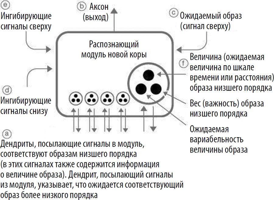 Третий и последний элемент образа – это набор образов более высокого порядка, в состав которых он входит. Для буквы «А» это все слова с буквой «А». Здесь вновь уместно сравнение с веб-страницей. Каждый распознанный образ более низкого порядка запускает распознавание образа более высокого порядка, содержащего первый образ. В новой коре эти связи осуществляются дендритами, соединяющимися с нейронами в каждом распознающем модуле коры. Помним, что каждый нейрон может получать сигналы от множества дендритов, но выдает единственный сигнал на аксон. Этот аксон, однако, может, в свою очередь, передавать сигнал множеству дендритов.