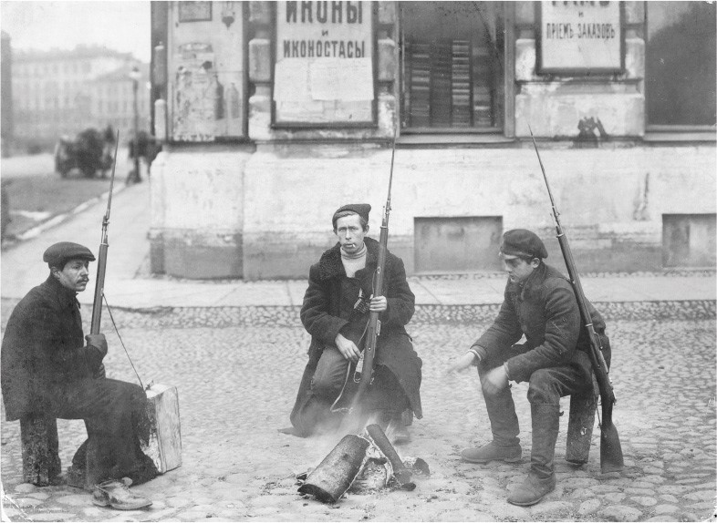 Красногвардейцы у костра в дни Октябрьской революции. Петроград, октябрь 1917 года[14]
