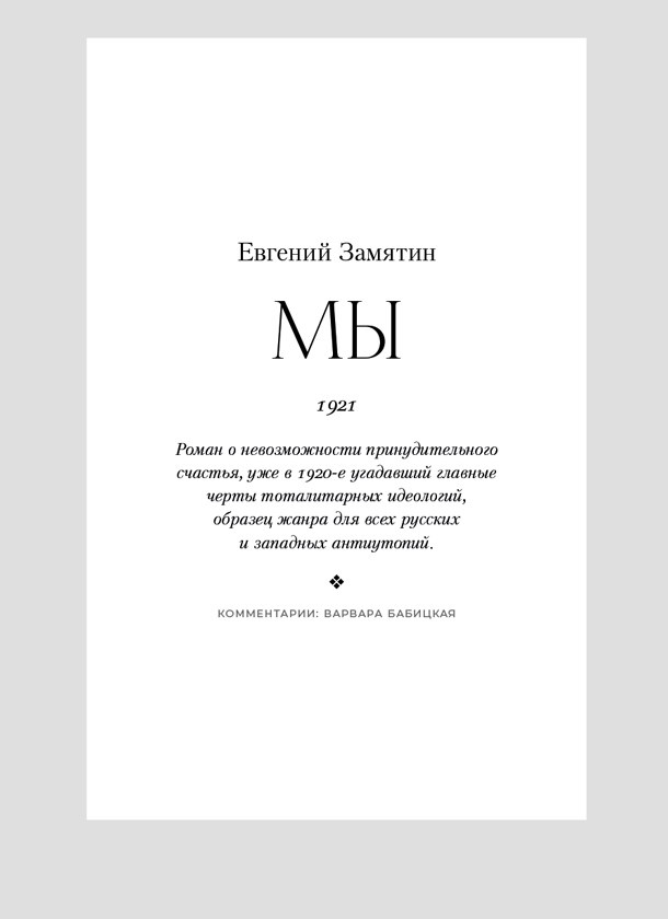 В России, однако, книгу не пропустила цензура: то, что роман «непроходной», стало окончательно ясно к 1924 году. Вероятно, по причине этого запрета роман впервые вышел в свет в английском переводе Г. Зильбурга – в том же 1924 году, в Нью-Йорке. За этим последовали чешский (Прага, 1927) и французский (Париж, 1929) переводы – роман стал важной частью мировой литературы прежде, чем добрался до русского читателя. По-русски роман «Мы» впервые был издан пражским журналом «Воля России»[25] (номера 2–4 за 1927 год) – без ведома и согласия автора, в сокращённом варианте и, что примечательно, в обратном переводе с чешского языка.