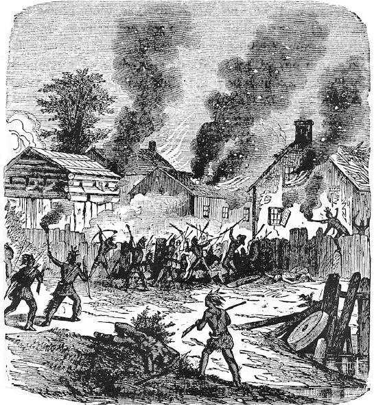 Нападение индейцев на Брукфилд в Коннектикуте. Рисунок. XIX век