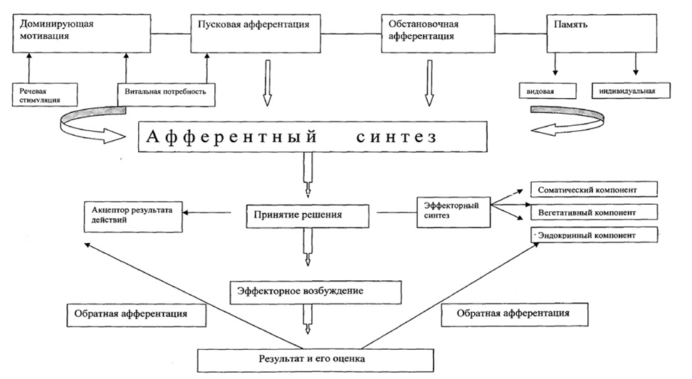 Наиболее совершенная модель структуры поведения изложена в концепции функциональных систем П.К. Анохина (1898-1974). Согласно этой концепции первой стадией поведенческого акта считается афферентный синтез, заключающийся в анализе нервной системой сигналов, поступающих из внешней и внутренней среды, имеющих значение для удовлетворения наличной потребности. На характер и результат афферентного синтеза оказывает влияние существующая мотивация, информация наследственной и приобретенной памяти, обстановочная (соответствующая моменту) и пусковая (стартовая) афферентация. По завершению афферентного синтеза начинается стадия принятия решения, заканчивающаяся эфферентным возбуждением, выливающимся в целенаправленном поведении. При недостаточном удовлетворении потребностей наступает стадия обратной афферентации.