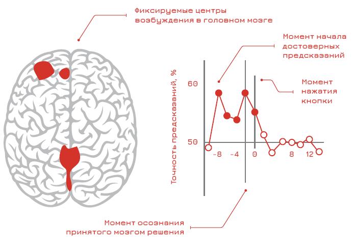 По логике вещей активность мозга и сознательное решение должны совпадать. Однако оказалось, что мозг активизировался в среднем за те самые полсекунды до того, как человек принимал решение поднять руку.