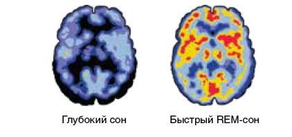 Рис. 5. Активность мозга человека, находящегося в разных состояниях сна и бодрствования, зафиксированная с помощью ПЭТ.