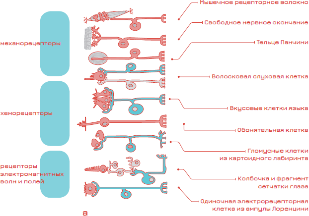 Наружу наш мозг выставил детекторы фотонов, разных химических веществ, датчики давления и т. д. При всём кажущемся многообразии наших ощущений они производятся весьма ограниченным набором физических воздействий (рис. 1а, б).