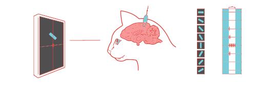 Схема классического эксперимента Д. Хьюбела и Т. Визеля (Слева на вертикальной диаграмме изображены предъявляемые животному стимулы, справа – интенсивность реакции нейронов зрительной коры, в которые был установлен воспринимающий нейронные разряды электрод)