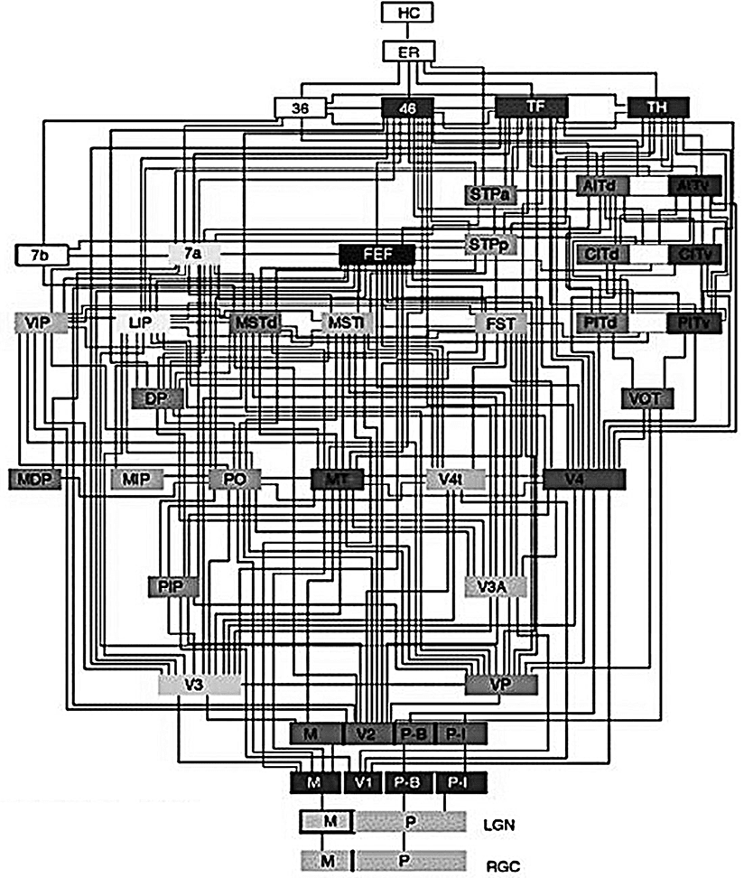 Так выглядит анатомическая схема лишь одного зрительного пути обезьяны, воспроизведенная Дэвидом ван Эссеном (рис. 1). Количество обратных связей в ней превышает число нитей, идущих от каждой области в следующую, стоящую выше по иерархии. Очевидно, что у человека схема такого самореференцирующего зрительного пути значительно сложнее, и радикальное преобладание этих отсылок не к тому, что воспринимается в реальности, а к тому, что уже содержится в мозге, однозначно свидетельствует о том, что реальность является для нашей психики только «информационным поводом», все остальное она, как «хороший» журналист, додумывает сама.