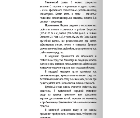 Вьюнок полевой, Convolvulus arvensis: воздушные части растения содержат стигмастерол и рутин. Растение кумулирует соли Cu, Cr, Cd, очень много вит С; водный и водно-спиртовой экстракт нч – гипотензивное, противосудорожное, спазмолитическое, миотропное; в традиционной (травяной) медицине применяется только свежая трава его; этилацетатная фракция листьев C. arvensis обладает сильной АО активностью. Научные исследования показали, что экстракты вьюнка обладают цитотоксическими, антиоксидантными, вазорелаксатными, иммуностимулирующими, антидиареальными, гепатопротекторными, антибактериальными и диуретическими свойствами; экстракты обладают противоопухолевыми свойствами; гипотензивное; антибактериальное – воздействие против Bacillus subtilis; Staphylococcus aureus; Pseudomonas aeroginosa; Klebsiella pneumonia. По [4]: свежий – при ранах; по [21]: болезни ВДП, рецепт; по [33]: бронхит, бронхиальная астма, отёки, наружно – при болезнях кожи; противоопухолевое. Нельзя при гипотонии и беременности. ИС: повязка – нет равных при ожоге от огня, особенно с мазью из воска; сок в больное ухо; от астмы; для груди и лёгких; от закупорки печени; с уксусом – для селезёнки; сок гонит перегоревшую желчь. По [Симонова, др]: терапевтические эффекты: мочегонный, ранозаживляющий, обезболивающий, слабительный, кровоостанавливающий, спазмолитический. Показания к применению: почечная недостаточность, сердечная недостаточность, гастриты, запоры, зубная боль, заболевания печени, селезёнки, ОРЗ, бронхит, наружно – дерматомикозы, дерматиты.