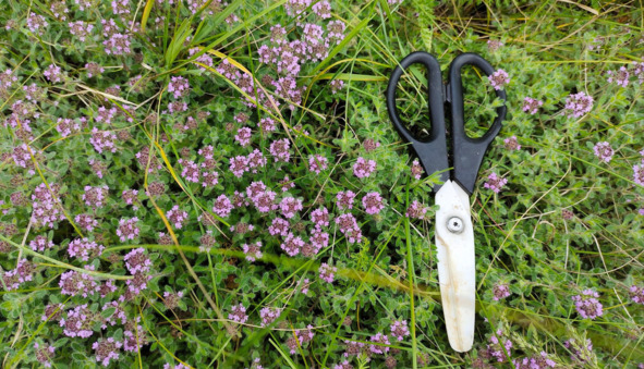 экологично для растения и чтобы не уничтожить ЭИ-составляющую растения собираю Тимьян с помощью керамических ножниц