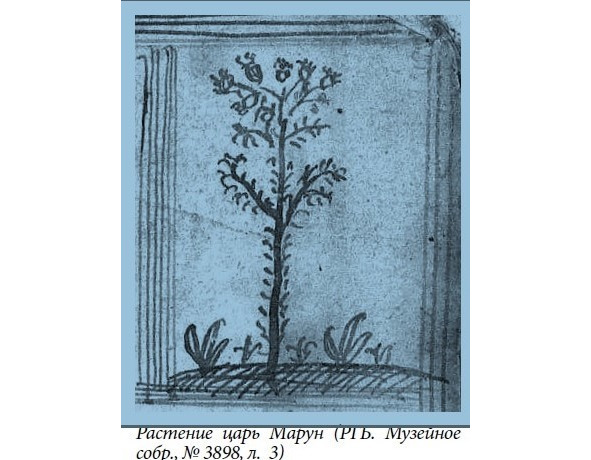 Трава царь Марун, она ж и Мордвиник и татарин, ростёт всюду, ростом высока, собою коловата, по всей по ней иглы, простою рукою брать нельзя. Цвет на ней что шипы, корень морковной. Пригодна держать оную траву на дворех и в хоромах и на оной траве строения ставить – нечистои дух не прикоснётся.