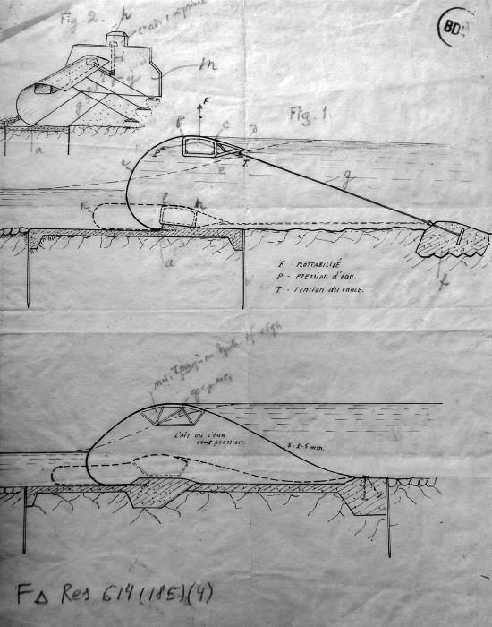 Чертеж гибкой плотины, выполненный Замятиным (предположительно начало 1910-х годов) (BDIC, Collection Е. Zamiatine – F DELTA RES 614)