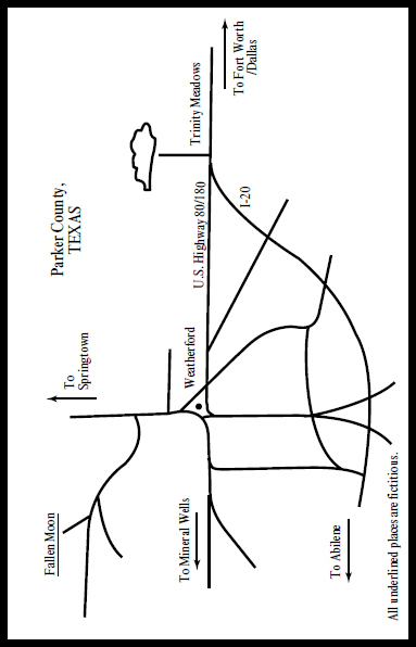 Damn, where was all this rain coming from? Spring weather in Texas was temperamental, but this was ridiculous. Slowing to a crawl, he leaned forward over the steering wheel and peered into nothingness. There should be signs of civilization. A light. Anything. The town of Fallen Moon couldn’t be more than a few miles ahead. He’d get a room there and find Melissa Carnes in the morning.
