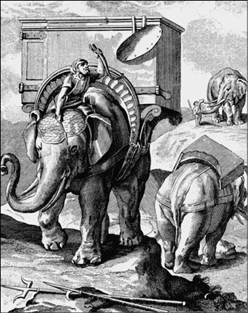В Индии, где слоны были относительно недороги, на них, кроме боевых, возлагались и транспортные функции. В качестве вьючных животных слоны могли долго нести до 600 килограммов грузов, и имели лишь тот изъян, что нуждались в свежих листьях – одним сеном они обходиться не могли. Да и сено в необходимом слонам количестве, в отличие от овса, почти не поддавалось перевозке. Накормить большую армию слонов во время долгого перехода всегда было серьезной проблемой.
