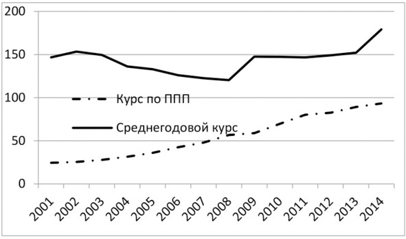 В заключение этого раздела еще раз подчеркну, что номинальный курс не имеет никакого отношения к уровню и качеству жизни, он определяется только оптовыми ценами торгуемых товаров. Сравнение показателей развития экономики и вообще каких-то значимых показателей по номинальному курсу не имеет смысла. Смысл имеет курс по паритету покупательной способности.