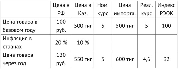 Поясню на примере определенного товара. Допустим, в базовом году курс тенге к рублю составляет 5 тенге, товар в России стоит 100 рублей, а в Казахстане он стоит 500 тенге. Предполагается, что в базовом году все находится в равновесии, то есть реальный курс равен номинальному и равен 5 тенге за доллар. Через год ситуация изменилась: инфляция в России составила 20%, а в Казахстане 10%, то есть в России этот товар стоит теперь 120 рублей, а Казахстане он же стоит 550 тенге. Реальный обменный курс, то есть тот курс, при котором цены на эти товары должны сравняться, теперь составляет 4,6 тенге за российский рубль, а номинальный остался равным 5. Соответственно, РЭОК стал равен 92 (4,6 разделить на номинальный в 5 тенге за рубль). Снижение РЭОК означает улучшение позиций казахстанских производителей по сравнению с предыдущим годом, то есть рост конкурентоспособности реального сектора отечественной экономики.