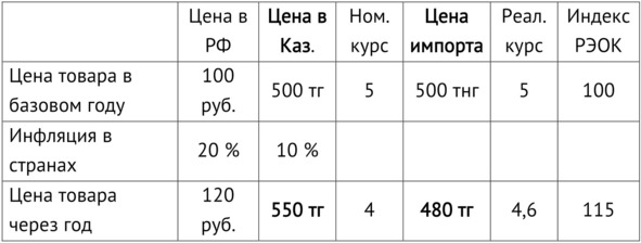 Если же номинальный курс через год стал равен 4 тенге за рубль, то ситуация становится обратной. Теперь уже российский производитель идет на казахстанский рынок с солидным запасом прочности: продавая свой товар по 550 тенге и конвертируясь по номинальному курсу, он получает 137,5 рубля вместо 120. И наоборот, казахстанский производитель, продавая товары на российском рынке за рубли, после конвертации по номинальному курсу получит только 480, а не 550 тенге. Значение РЭОК в таком случае вырастает до 115 (4,6 – реальный обменный курс разделить на 4 тенге к рублю номинального курса).