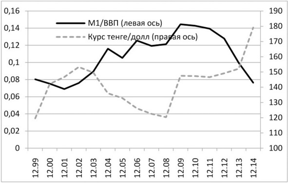 Ниже приведен график агрегата M1/ВВП и курса тенге к доллару, по данным Национального банка РК. Денежный агрегат М1 – это количество тенге в экономике как наличных, так и безналичных. Понятно, что чем больше ВВП, тем больше денег нужно, чтобы обслуживать расчеты между субъектами экономики, бизнесом и населением. Из графика видны проблемы голландской болезни: сильное укрепление тенге на фоне резкого роста его количества, для того чтобы хоть как-то компенсировать наплыв валюты.