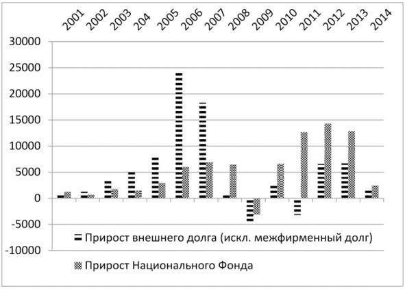 Ниже приведен график ежегодного прироста внешнего долга и роста внешних активов (Национальный фонд и золотовалютные резервы, по данным Национального банка) в млрд долларов США.