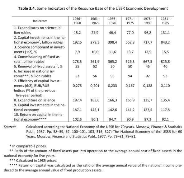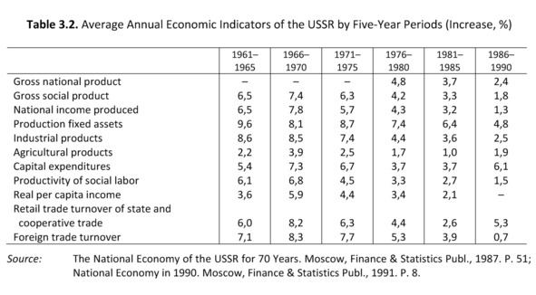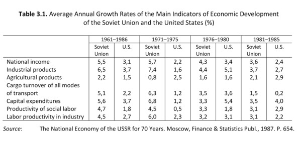 As can be seen from Table 3.1, the USSR was basically ahead of the United States in terms of the average annual growth rates of national income, industrial and agricultural production, capital investment, and some other indicators. At the same time, in the context of the five-year periods presented in the table for the USSR, there is a noticeable tendency to reduce the growth rates of almost all economic indicators.