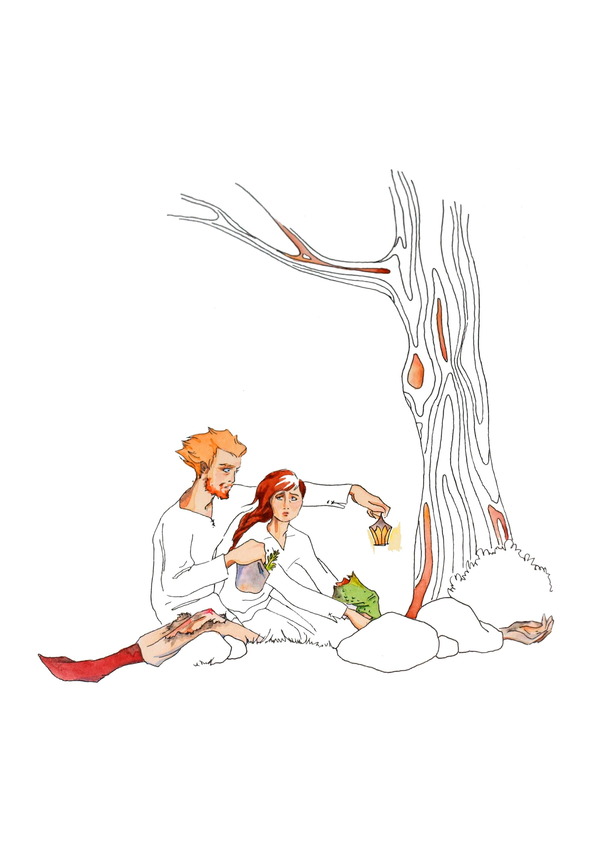 Артур стер грязь и землю с лица теплой ароматной водой, и через несколько минут все собрались за столом. Лори быстро уминал большой кусок окорока, Магда грела руки о кружку с чаем, а гость сидел и почти не двигался. Он исподлобья внимательно смотрел на хозяев этого странного дома. При свете магического фонаря все было видно четко, будто на свежей гравюре. Он решил сперва присмотреться к Лори. Взъерошенные волосы Лори отливали медовым блеском. Короткая медная борода добавляла его красивому мужественному лицу свирепости. Большие глаза Лори цвета грозовых туч были полны глубоких мыслей… Артур перевел взгляд на Магду. Длинные черные волосы были собраны в сложную растрепанную косу. Но даже в косе был виден их странный красный блеск (точно колдунья!). Уставшими глазами цвета черного агата она смотрела, как струйки пара поднимаются из её кружки. Она держала кружку тонкими, бледными от холода пальцами. Почувствовав на себе взгляд, Магда внимательно посмотрела Артуру прямо в глаза и с дружелюбной улыбкой спросила.