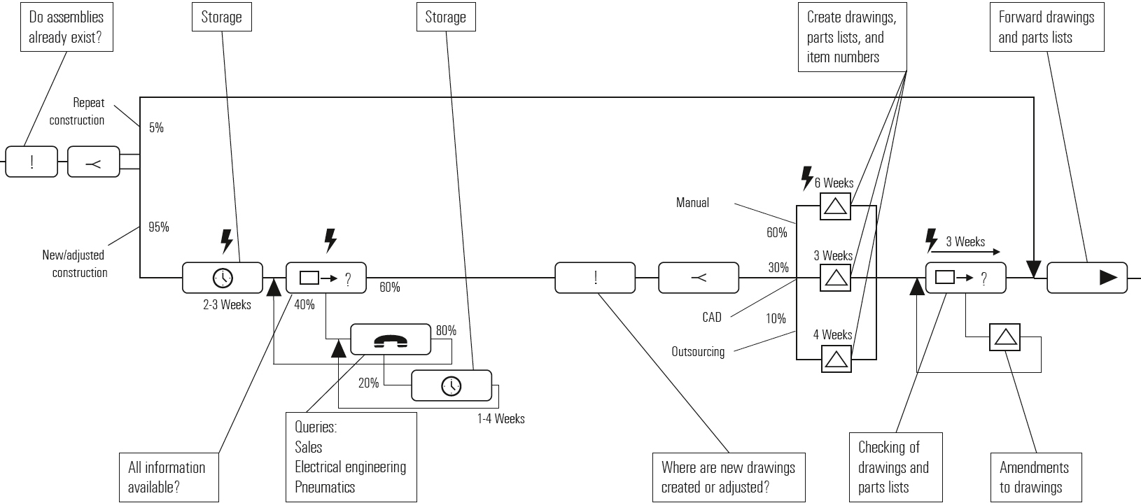 [44] Process maps, for example, can be used to show as-is (i.e., real) processes. These descriptive recording instruments enable empirically recording processes (i.e., as existing in reality) and displaying them as a process diagram (Figure 1-15). These process maps provide the basis for continuously improving such sequences of activities, because they illustrate the interdependencies of these activities.
