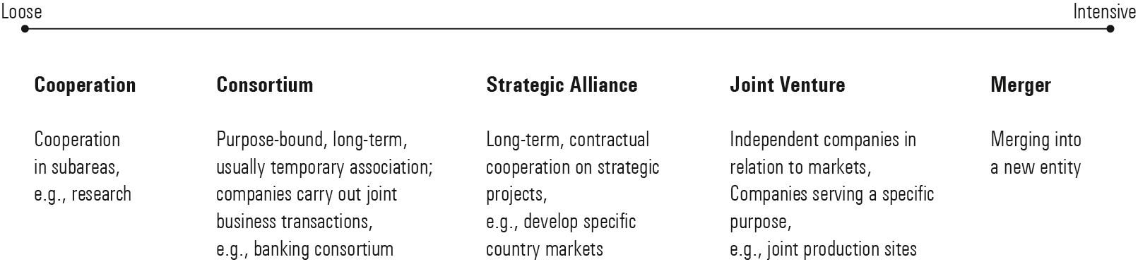 [48] Thus, the demands on management, management structures, and managers vary depending on the type of company. However, companies change their structure not only through endogenous development processes, but also through interactions with other companies, including cooperation, consortia, strategic alliances, joint ventures, and mergers (Figure 1-18).