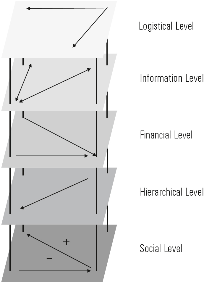 [39] These different levels influence each other (Figure 1-10). Thus, good interpersonal relations between two department heads positively impacts the logistical level by facilitating cooperation.