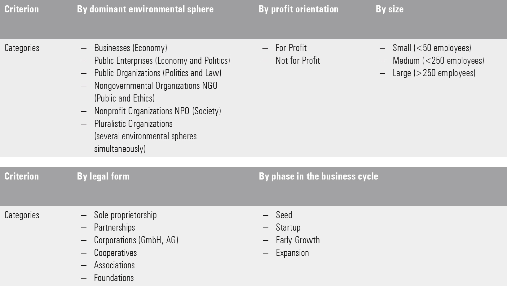 [45] How the management tasks described above are prioritized and performed, and how the corresponding questions are answered, depends not only on the environmental context but foremost on the type of organization. Various criteria (Figure 1-16) can be used to typify organizations (based on Rüegg-Stürm & Grand, 2020, p. 36; Thommen, Achleitner, Gilbert, Hachmeister, & Kaiser, 2017, p. 25).