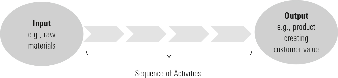 [41] Processes can be defined as a sequence of activities leading from one or more types of input to an output (see Porter, 1985) (Figure 1-4). The foundation and primary process of every organization is value creation. An organization defines itself in terms of its services. This orientation toward the customer value of a service is represented by the business processes at the heart of the St. Gallen Management Model (SGMM).