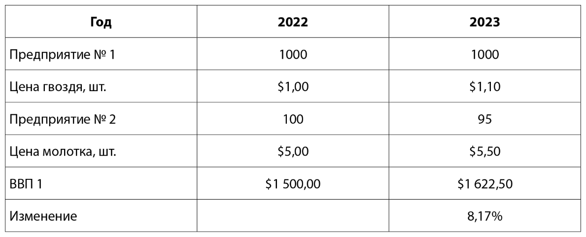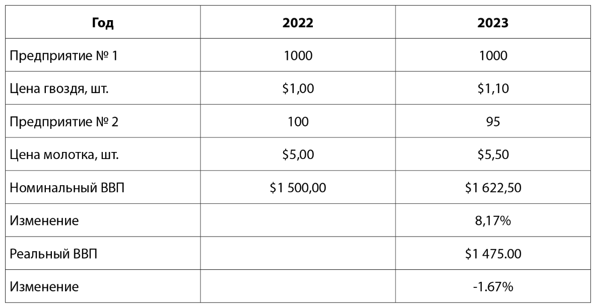 Всегда ли рост ВВП означает рост экономики?Представим себе простой пример: у нас есть страна А, где работают только два предприятия. Одно производит гвозди, а второе – молотки. В 2022 году первое предприятие произвело 1000 гвоздей и продало их по 1 доллару за штуку, а второе – 100 молотков, и они были проданы по 5 долларов за штуку. В следующем году первое предприятие по-прежнему произвело 1000 гвоздей, но продало их на 10 % дороже, а предприятие № 2 повысило цену на продукцию, но снизило производство.