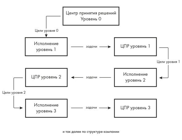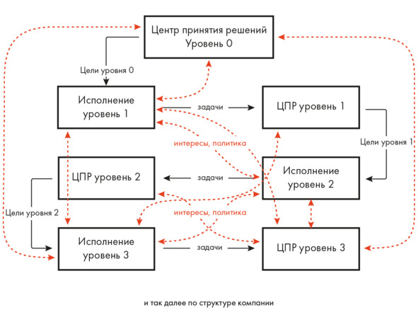 На каждом уровне происходит адаптация полученной информации, так как цели верхнего уровня должны быть привязаны к уровню исполнения с помощью задач. Цель «выйти на рынок Х» на нулевом уровне породит каскад специализированных задач и подцелей для департаментов производства, продаж, маркетинга, логистики и т. д.