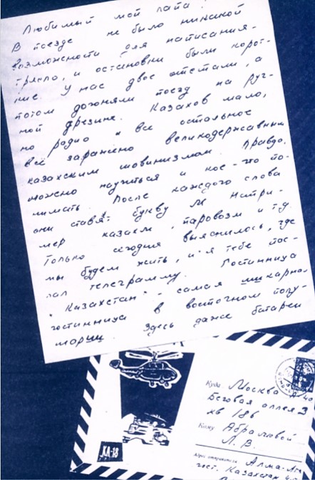 На снимке – конверт первого письма В. Высоцкого из КазССР со штемпелем от 10 января 1963 года из гостиницы «Казахстан», предоставленное Музеем Высоцкого в Чимкенте. В этом письме молодой Владимир «грыз занавески». Именно этот конверт лёг в основу оформления обложки воспоминаний Л. Абрамовой.